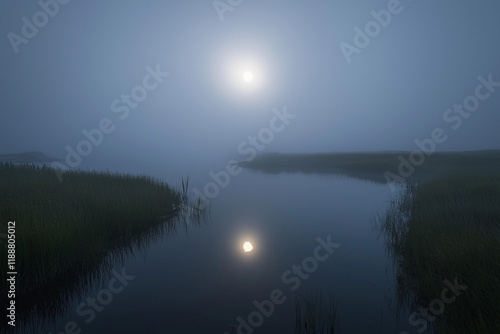 Fototapeta premium Morning fog blankets tranquil river at dawn