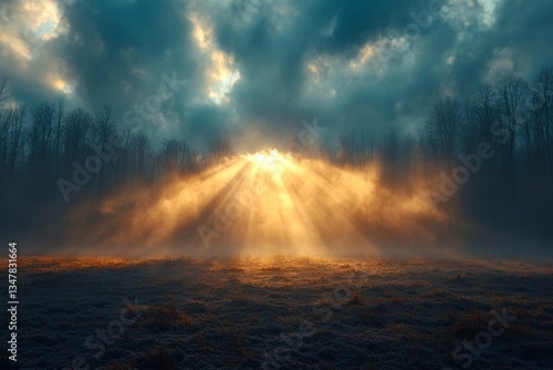 © Юлія Ткачук, Obraz premium Morning fog envelops a huge solar field, the sun's rays break through the clouds.