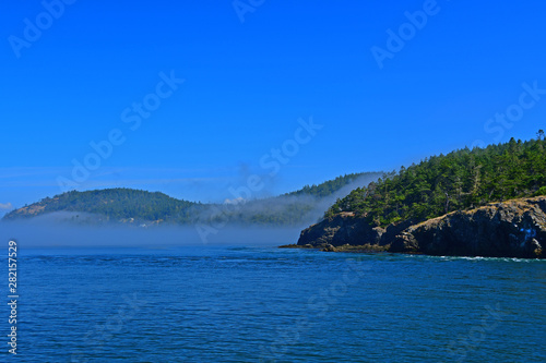 Fototapeta premium Morning fog hugs the coast of Deception Pass as it enters the Salish Sea in...