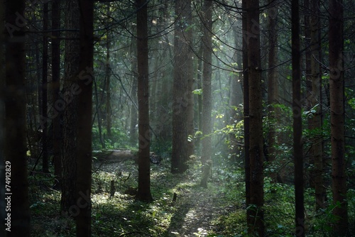 Fototapeta premium Morning fog in a dark and mystical forest in Latvia