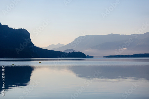 © Olha Sydorenko, Fototapeta premium Morning fog over scenery lake Wolfgangsee in Austrian Alps