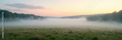 Fototapeta premium Morning fog rolls in across a misty landscape with a few wispy clouds, soft, gently rolling,