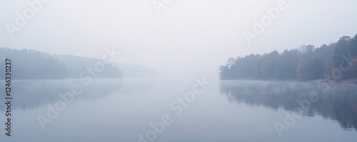 © AiGallery, Fototapeta premium Morning foggy lake with a light gray sky and a violet wave in the distance, fog, landscape