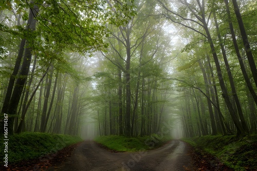 © Mahannan, Fototapeta premium Morning forest road with foggy trees and autumn leaves