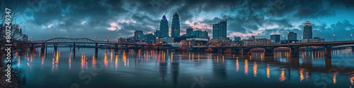 © Serhii, Fototapeta premium Morning Glow: Skyline Over a Bridge and Downtown Business District - Tennessee Travel and