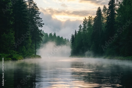 © Dimass, Fototapeta premium Morning haze over still forest river