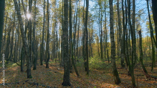 Fototapeta premium Morning in autumn forest. Beautiful forest in autumn with bright sun shining through trees. Timelapse.