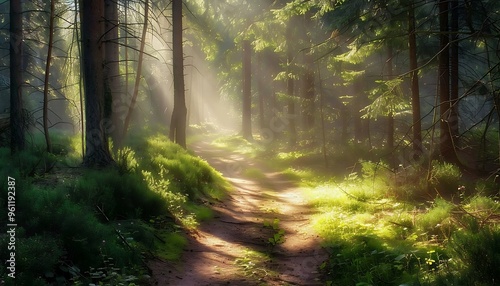 Obraz premium Morning in the autumn forest with sunbeams