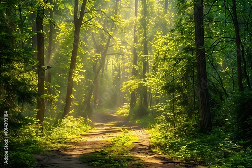 © Creative Laik, Obraz premium Morning in the green forest. Sun rays through the branches of trees