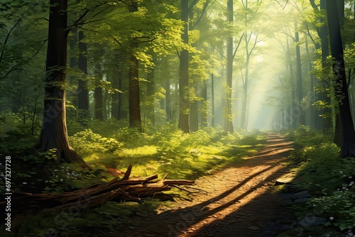 Obraz premium Morning in the green forest with sunbeams and rays of light, AI Generated