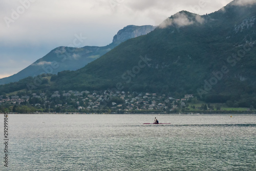 Fototapeta premium Morning landscape on Lake Annecy, France. In the background are the mountains of the Alps. On the lake in the distance you can see the silhouette of a man kayaking.