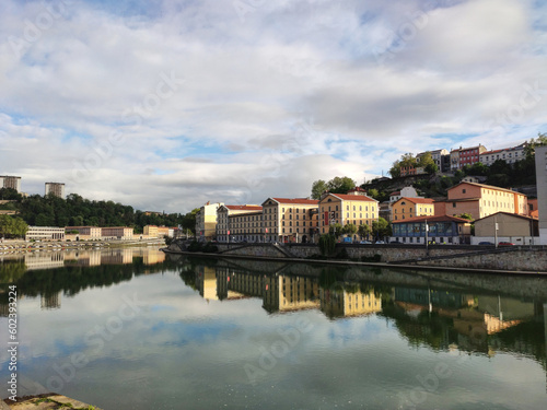 © EricG, Fototapeta premium Morning light and reflections on Saone river, quay Saint Vincent, and "Les Subs" art school and venue, Lyon, France