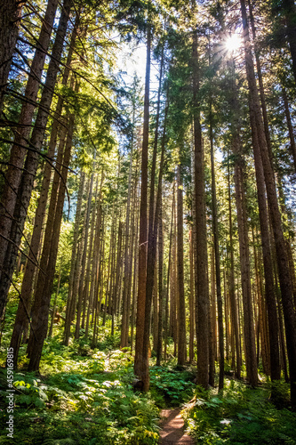 © Harrison, Fototapeta premium Morning light filters through the trees in a quiet evergreen forest