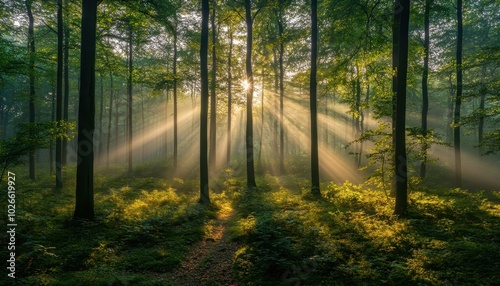 © Anastasiia, Obraz premium Morning light filters through trees in a serene forest landscape