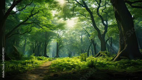 Naklejka premium Morning light in the forest with sunbeams and lens flare.