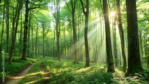 © Luckystation, Obraz premium Morning light in the misty forest with trees and a peaceful path through the woods
