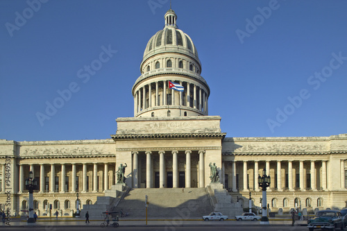 © spiritofamerica, Obraz premium Morning light on the Capitolio and Cuban Flag, the Cuban capitol building and dome in Havana, Cuba