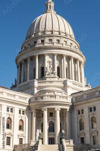 Obraz premium Morning light on the Wisconsin state capitol building in late fall. Madison, Wisconsin, USA.