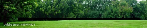 © BrandwayArt, Obraz premium Morning Light Shines Over Lush Green Meadow Surrounded by Vibrant Trees