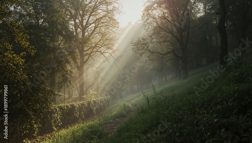 Obraz premium Morning Light Shines Through Trees in a Misty Forest Path