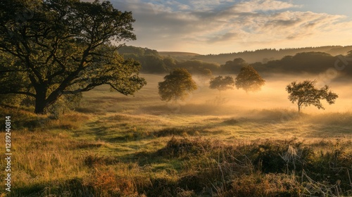 Obraz premium Morning light spills over a tranquil landscape. Mist dances among the trees...