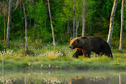 © ondrejprosicky, Fototapeta premium Morning light with big brown bear walking around lake in the morning light. Dangerous animal in nature forest and meadow habitat. Wildlife scene from Finland near Russian border.