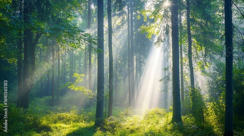 Obraz premium Morning mist lingering in a dense forest, with bright beams of sunlight filtering through the trees, creating a warm, peaceful atmosphere. Real photo, stock photography.