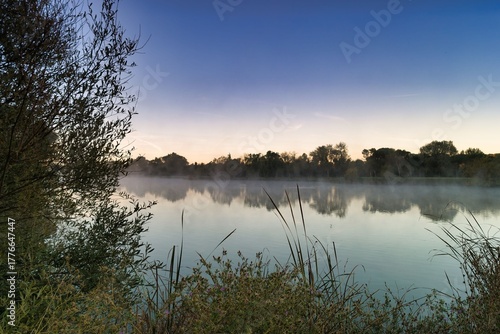 © Piotr, Fototapeta premium Morning mist over a tranquil river in a quiet natural setting with lush trees and calm waters