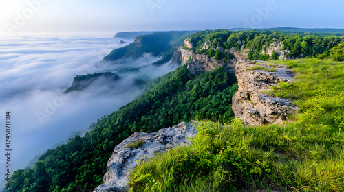 © Giman, Fototapeta premium Morning mist over valley cliffs, scenic vista
