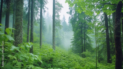 Fototapeta premium Morning mist rolling through a dense forest foggy weather