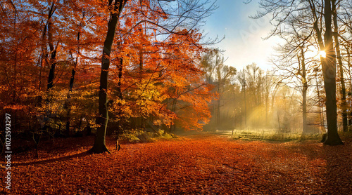© Darcos, Fototapeta premium Morning mists and sun autumn forest with gold and red leaves