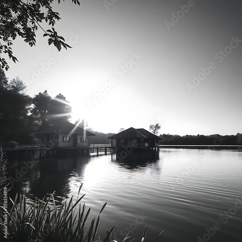 Fototapeta premium morning on the lake, eco-friendly bungalow on a tranquil lake, lush greenery, morning sun, golden glow, deep shadows, dramatic