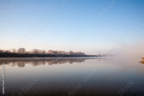 © mironovm, Fototapeta premium Morning on the river early morning reeds mist fog and water surface on the river