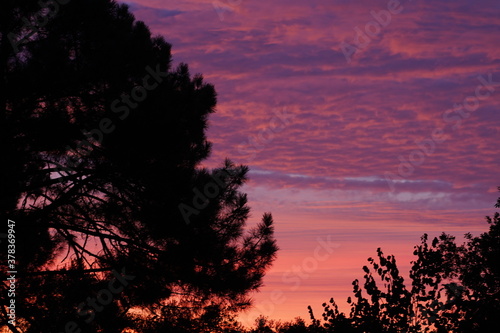 © Elena, Fototapeta premium Morning red light on the cedar forest. Incredible sunrise over the dark silhouette of a forest cedar tree. Red sunlight and forest landscape on autumn. High quality photo
