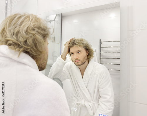 Obraz premium morning routine, young man looking in mirror in bathroom