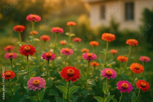 © The 2R Artificiality, Fototapeta premium Morning scene of Zinnia flowers blooming in a backyard garden