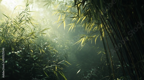 Fototapeta premium Morning Serenity in Bamboo Grove, a tranquil scene of verdant bamboo stalks illuminated by gentle sunlight, symbolizing renewal and growth