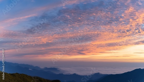 Obraz premium Morning sky with glowing altocumulus clouds and distant mountains at sunrise