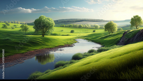 Obraz premium Morning Spring Landscape featuring Blue Sky and Green Grass Field, Generative AI