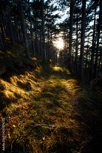 Obraz premium Morning sun beams in the spring forest