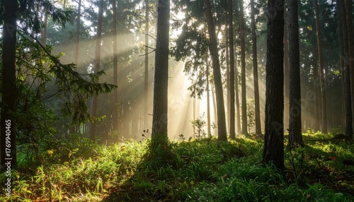 Obraz premium Morning sun filtering through dense forest trees