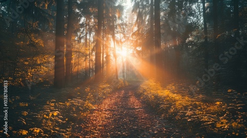 Fototapeta premium Morning sun rays filtering through a dense forest, illuminating the path