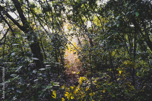 © Priyadarshi Ranjan, Obraz premium morning sun rays tree leaves forest