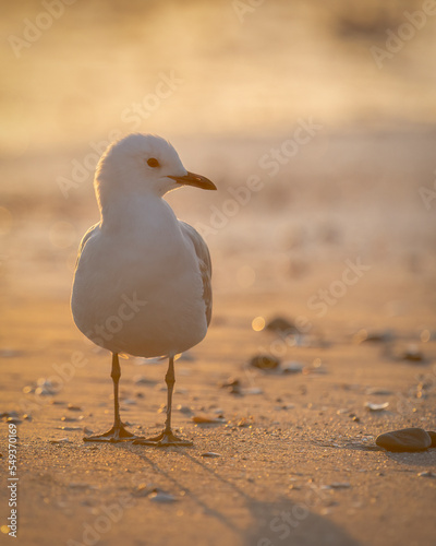 Fototapeta premium Morning sunlight casting soft backlight around a seagull. Vertical format.