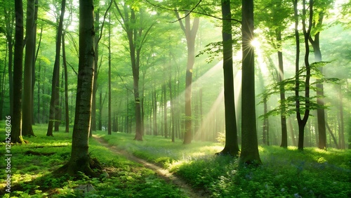 Obraz premium Morning sunlight filtering through misty forest trees with a peaceful path...