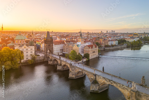 © pyty, Naklejka premium Morning sunlight gently illuminates Prague Castle in the background, while people stroll across Charles Bridge over the Vltava River, creating a serene early day scene in Prague.