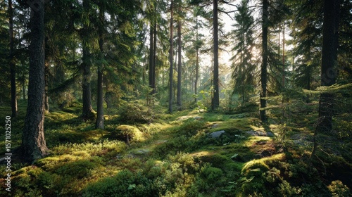 © Kai, Obraz premium Morning sunlight piercing through a lush green pine forest in early summer,