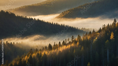 Fototapeta premium Morning sunlight piercing through soft mountain fog above pine forest peaks...