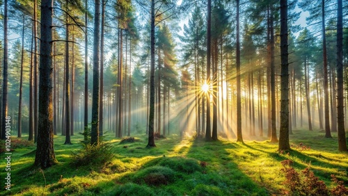 Fototapeta premium Morning sunlight shining through trees in a forest