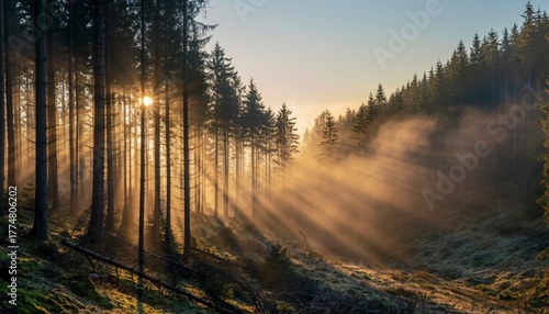 Fototapeta premium Morning sunlight shining through trees in misty forest